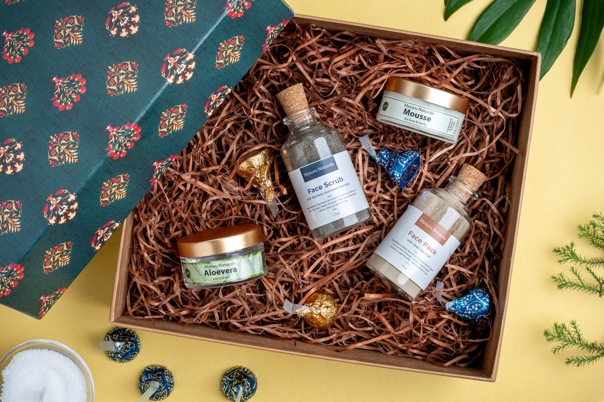 The Elegance Gift Box by Mysuru Naturals is a beautifully curated collection that brings together nature's finest skincare products for a luxurious and rejuvenating experience. Featuring Aloe Vera Gel, Cedarwood Mousse, and an exfoliating Face Scrub, this gift box offers a complete skincare routine that cleanses, hydrates, and revitalizes your skin.