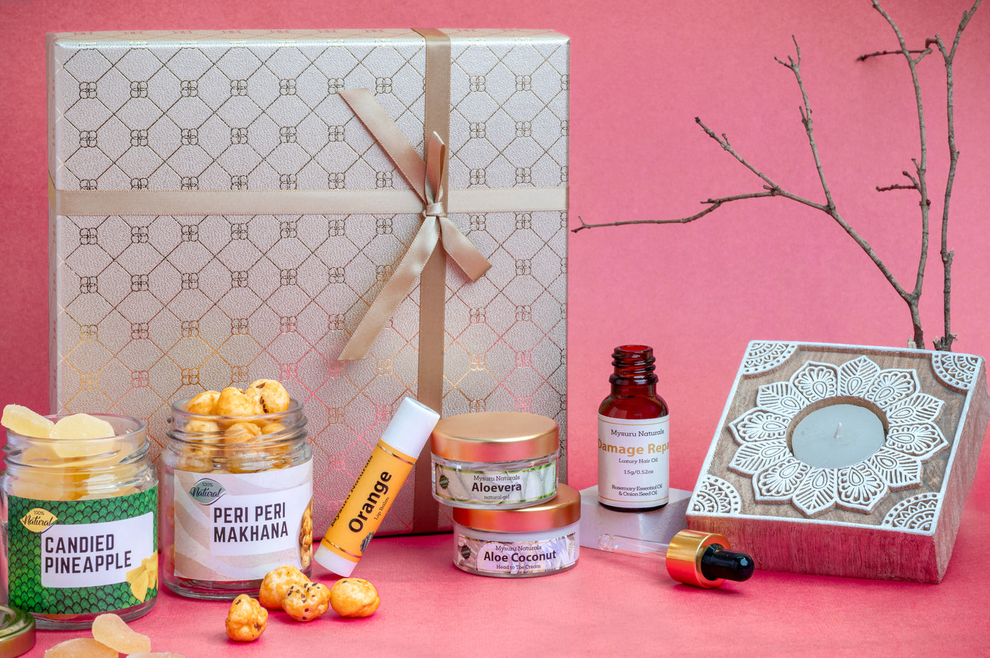In addition to skincare, the Festival Delight Gift Box includes festive treats like Candied Pineapple and Peri Peri Makhana, adding a touch of indulgence to your celebrations. The elegant Candle or Diya adds a festive glow, making this gift set perfect for special occasions.